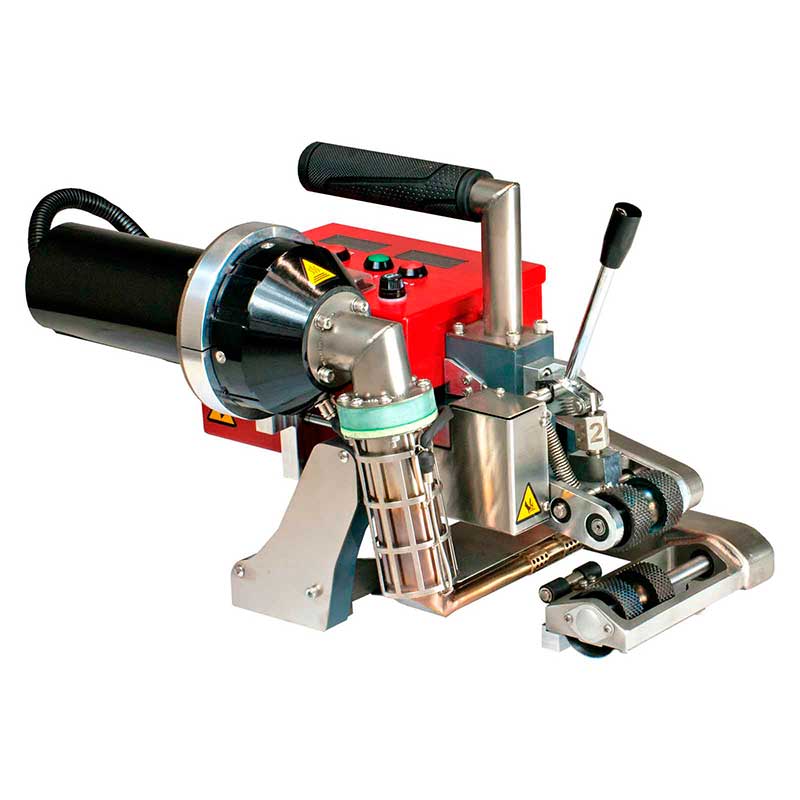 Используются для сварки конструкций из пластмасс, геомембран, листовых пластиков, емкостей и труб. Конструктивными особенностями данных аппаратов является нагрев камеры плавления присадочного материала при помощи горячего воздуха от встроенного термофена и наличие цифрового контроллера температуры. Может применяться как внутри, так и вне помещений.